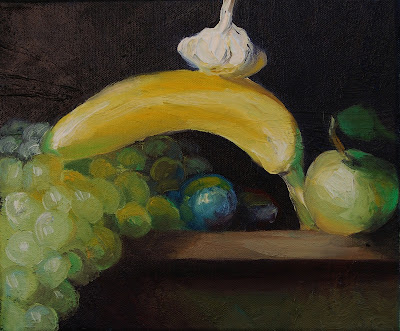 Winogrona z czosnkiem, olej, 24x30 cm. Obraz w kolekcji prywatnej Artysty fotografika, działacza kultury - Zenona Usarkiewicza, obecnie do obejrzenia z zbiorach stworzonego z jego inicjatywy Muzeum Kociewskiego w Wycinkach / 2010.